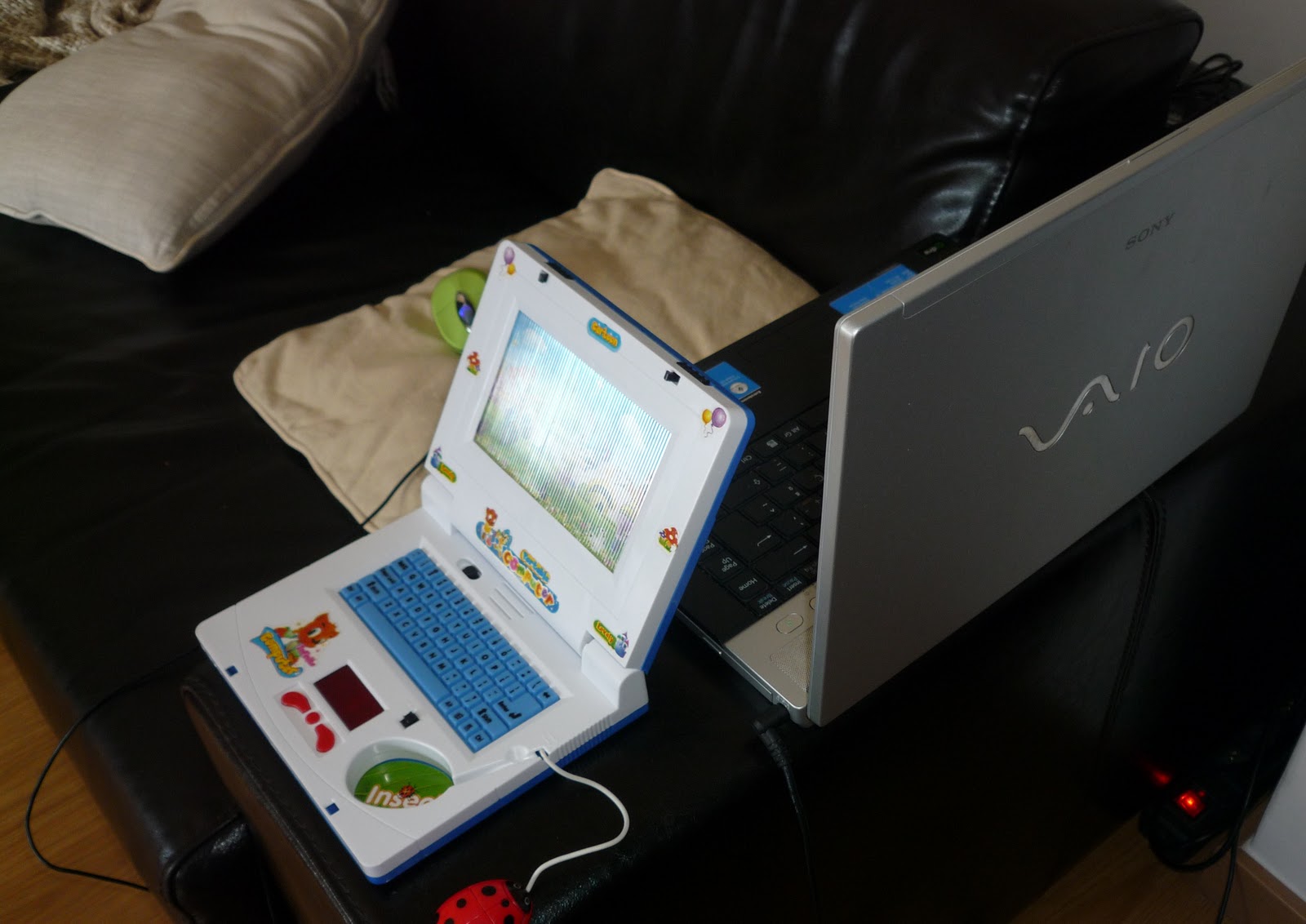 O Afonso adora computadores. Provavelmente por me ver a mim satisfeita a olhar para ele. Tanto, que se ri para o ecrã e faz de tudo para carregar nas teclas e no rato. Já estragou uma vez o computador à tia, e já deu conta de dois ratos cá em casa. Neste Verão, a tia Inês comprou-lhe um computador pequenino e a fingir. O Afonso adora. Mal a mamã liga o dela, ele vai todo contente buscar o dele, abre-o e clica e ri para o ecrã parado, como se mexesse. Faz aquela cara «importante» e «concentrada». Tivemos de tirar a pilha porque a música era muitooooo cansativa. Mas mesmo sem música e com a imagem parada ele adora o portátil dele. Está cada dia mais engraçado e eu amo-o tanto que até dói.