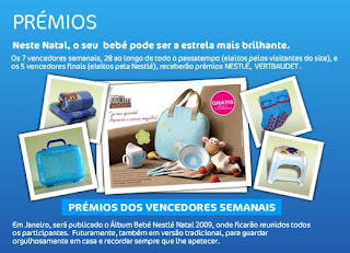 Este passatempo já não está no inicío mas ainda está a decorrer e é uma questão de tentarem a vossa sorte. Enviem uma fotografia do vosso rebento, junto a um produto Nestlé e com motivos natalícios e se for uma das sete mais votadas semanalmente, ganhará prémios. O Afonso ficou entre os 7 primeiros apenas na terceira semana. Também podem enviar uma foto para a morada indicada na página do passatempo e nesse caso quem vota é o júri da Nestlé. Os prémios são de encher o olho, dêem uma espreitadela http://www.nataldobebe.com.pt/.