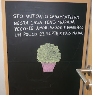 Nunca tive um manjerico que durasse tanto tempo mas por outro lado é só meio. Não é que uma lagarta comeu metade do manjerico toda contente? Ficou gorda e o manjerico ficou magrinho do lado esquerdo. Dita a tradição que o namorado deve ofertar um manjerico à sua amada com uma quadra bonita e brincalhona nas festas populares. Há tradições muitos giras de que me falam a minha mãe e avó, como a da procissão do Santo António e a da alcachofra brava. Diziam os antigos que para se saber se um amor era correspondido devia-se chamuscar na fogueira, a alcachofra em flor, e se ela voltasse a florir era porque o amor era verdadeiro e daria em casamento. Quanto às marchas populares têm origem nas “Maias”, festividade religiosa no mês de Maio e também nas marchas militares francesas do período Napoleónico. Nós acrescentámos-lhes os arcos e os balões, e o fogo-de-artifício e fizemos nossa a tradição. Vale a pena ler mais no blogue do Vítor Marceneiro http://lisboanoguiness.blogs.sapo.pt/213349.html.