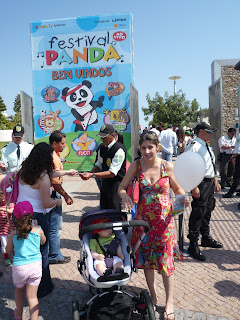 Hoje fomos ao Panda e o Afonso que até gritava "anda, anda" pelo caminho a apontar para o bilhete, afinal mal viu o Panda, porque o palco estava lá longe e era muita gente... Foi muito engraçado. À entrada dão-nos um mapa com os locais da animação, e claro que para os miúdos mais crescidinhos há imensas actividades, insufláveis, pinturas faciais, escorregas, todas boas para os cansar e nos darem uma noite tranquila. O espectáculo divide-se em dois concertos, um com a banda do Panda, e outro mais pequeno com as personagens do "Vila Moleza", ao final da tarde, que mete todas as crianças a pular e a gritar. Nota negativa para que nenhum dos espectáculos é ao vivo e igualmente negativa para o preço dos bilhetes, que é bastante caro, nomeadamente para as crianças que a partir dos três anos pagam um bilhete de adulto. Do recinto podem trazer-se muitos mimos gratuitos para os nossos rebentos e outros um pouco mais dispendiosos, como o merchandise do Panda. A título de exemplo, uma caneca com a fotografia do pequeno ao lado do Panda, custa 20€, o mesmo preço das toalhas de praia. Como estamos quase todos nesta fase, lá encontrámos algumas caras conhecidas o que só veio aumentar a animação. Na generalidade o Afonso achou mais graça aos meninos que ao espectáculo, mas fartou-se de rir e de andar e cansou-se tanto que chegou a casa a dormir. Obrigada Nestlé muitas vezes!